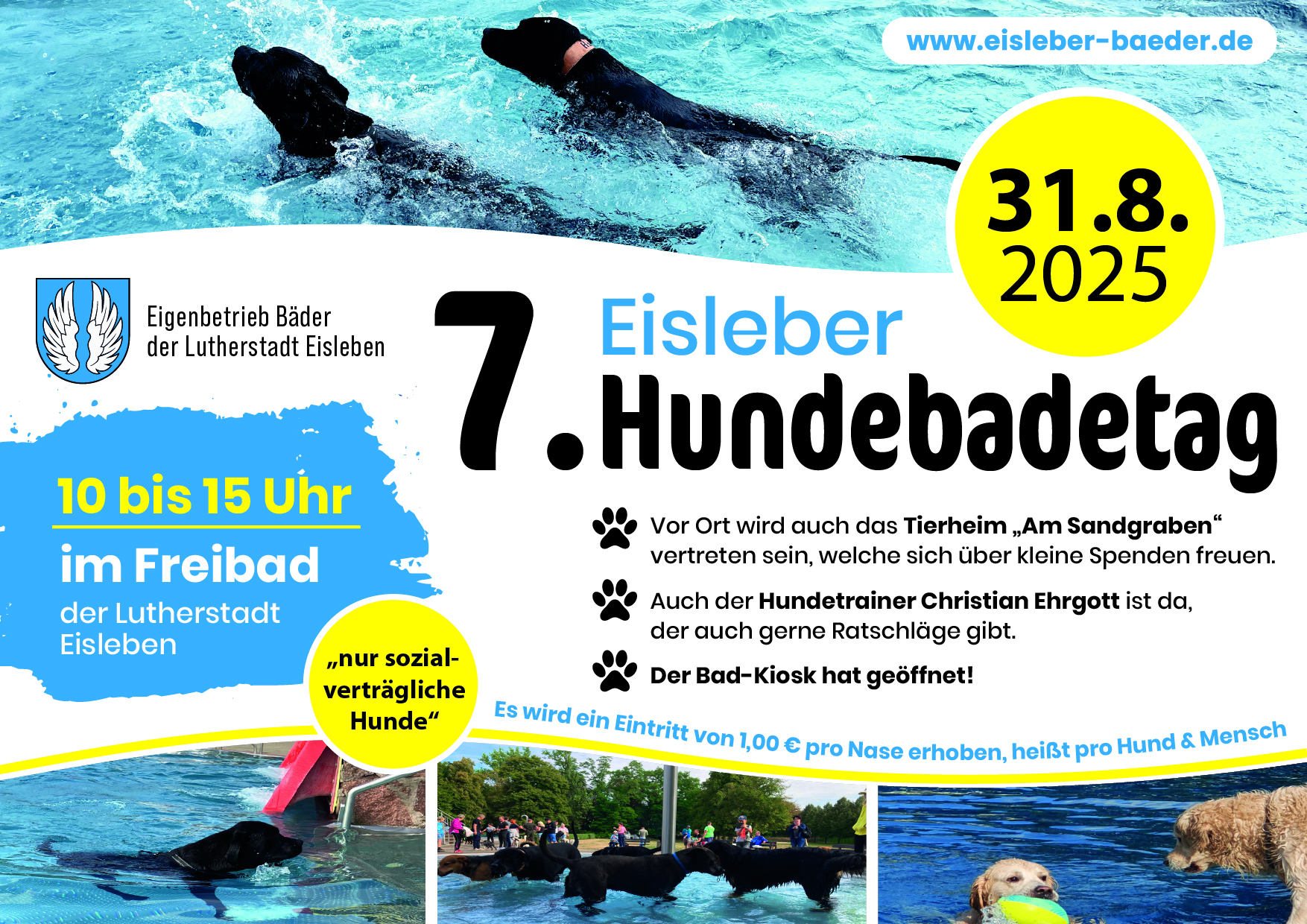Nicht vergessen! Zum Finale der Freibadsaison findet am 31.08.2025 von 10:00 bis 15:00 Uhr der beliebte Hundebadetag statt.